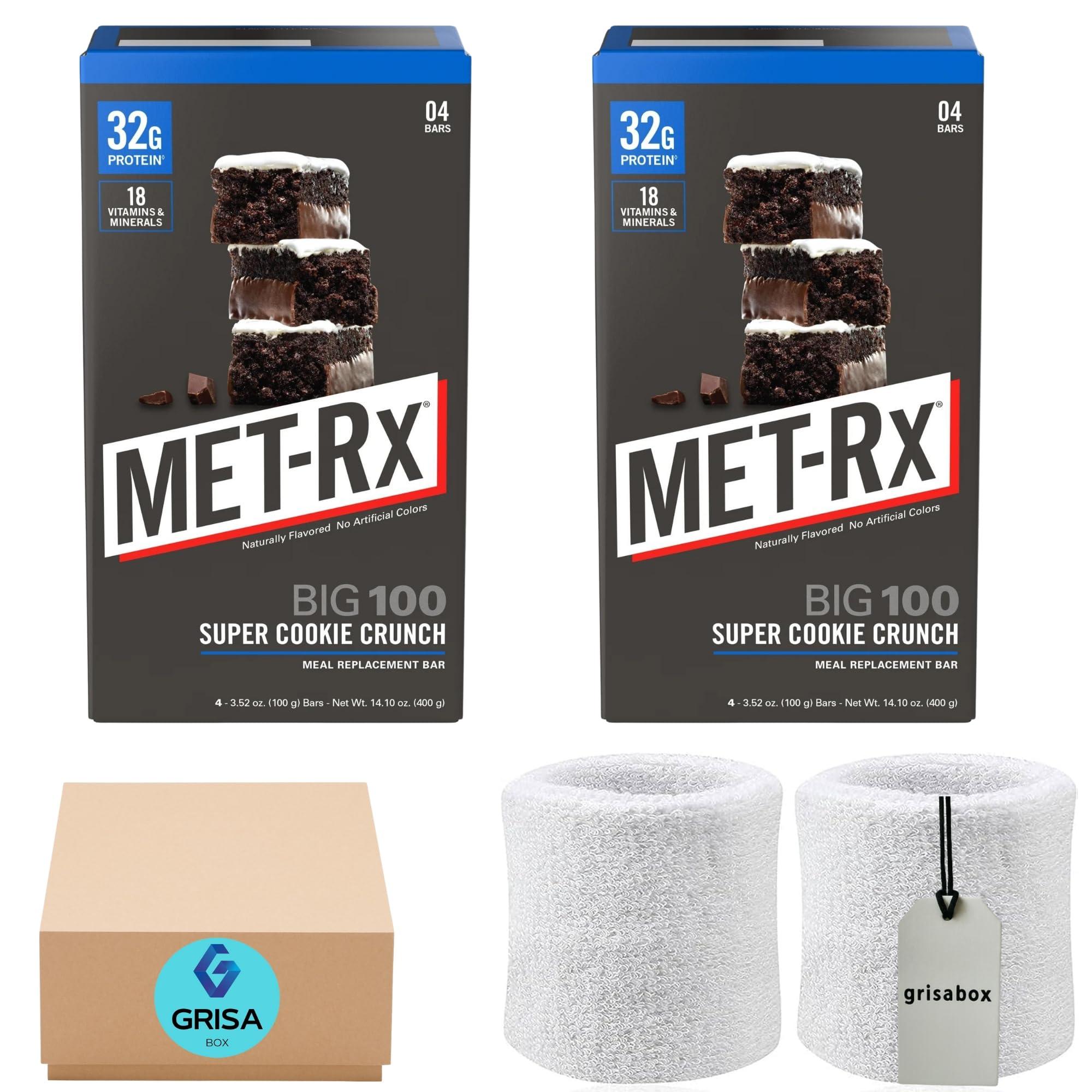 Meal Replacement Bars MET RX Big 100 Colossal Super Cookie Crunch Protein Bars are protein-packedmeal replacement bars that include high-quality protein to to fuel up on demand. Made with crunchy cocoa crisps and a smooth chocolate coating, this meal replacement bar delivers a delicious, satisfying taste. These nutritious MET RX bars are naturally flavored and they provide 18 vitamins and minerals, including a significant source of Zinc and Vitamins A and C. With 32 grams of protein per bar, this cookie bar is a great way to help promote muscle recovery.(1) These protein meal replacement bars include the MET RX Metamyosyn protein blend. Toss these high protein bars in your gym bag for a tasty cookie crunch chocolate protein bar treat pre workout or post workout, or enjoy these MET RX protein bars anytime you need a quick meal on the run. These Met Rx Bars come with 2 sweat Wristbands to help with your hard high intensity training.