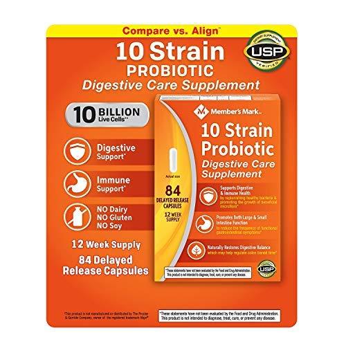 Member's Mark 10 Strain Probiotic contains 10 billion active cultures** per capsule and 10 strains of beneficial bacteria: Lactobacillus acidophilus, Bifidobacterium lactis HN019, Lactobacillus rhamnsosus GG, Bifidobacterium infantis, Bifidobacterium longum, Lactobacillus salivarius, Bifidobacterium bifidum, Lactobacillus plantarum, Lactobacillus paracasei and Bifidobacterium breve. This probiotic blend can help replenish healthy bacteria and support digestive and immune health.* Our formula contains a balance of both Bifidobacterium and Lactobacillus, which helps promote large and small intestinal health. We also include probiotic strains such as Bifidobacterium lactis HN019 and Lactobacillus rhamnsosus GG. These inclusions are based on clinical and scientific evidence for instance, a study on Bifidobacterium lactis HN019 showed that it may help regulate colon transit time.* Just one capsule per day of Member's Mark 10 Strain Probiotic provides some of the good bacteria beneficial for essential, everyday body functions.* *These statements have not been evaluated by the Food and Drug Administration. This product is not intended to diagnose, treat, cure, or prevent any disease. **This product contains 10 billion live bacteria when manufactured and until at least the "Best Used By" date, providing proper handling and storage directions are followed.]