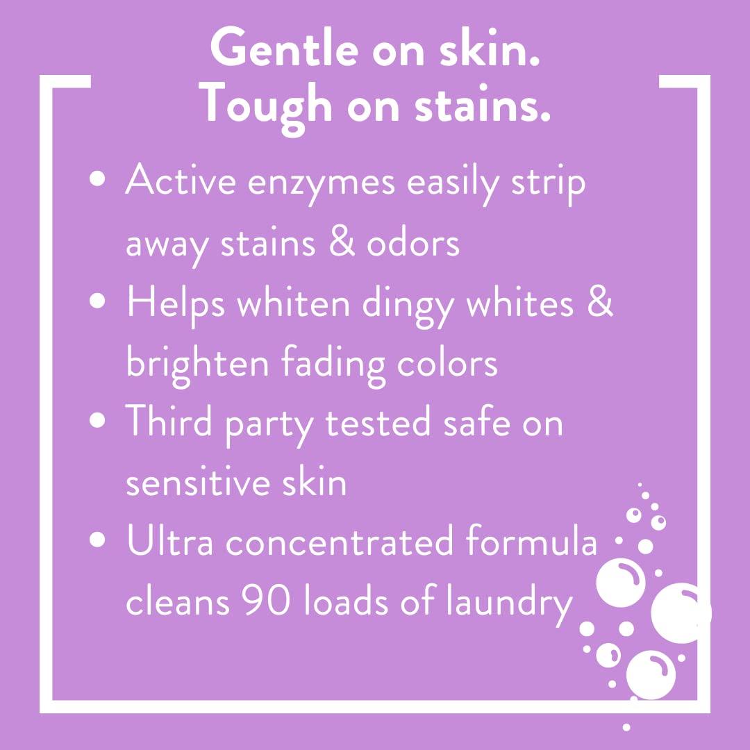 - POWERFUL CLEAN: Active cleaning ingredients from mother nature, capable of tackling your dirtiest loads of laundry. Quick dissolving in all water temperatures, removes stains and rinses clean with no residual chemicals, artificial dyes or fragrances left on clothes - when we say clean, we mean it!