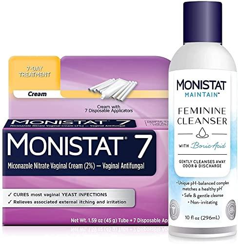 - Contains 1 bottle of MONISTAT Maintain Feminine Cleanser with Boric Acid, 10 fl oz and 1 box of MONISTAT 7-Dose Yeast Infection Treatment Combination Pack: 1 tube of Miconazole Nitrate cream, 1.59 oz, 7 empty disposable applicators and 1 tube of external itch cream, 0.32 oz