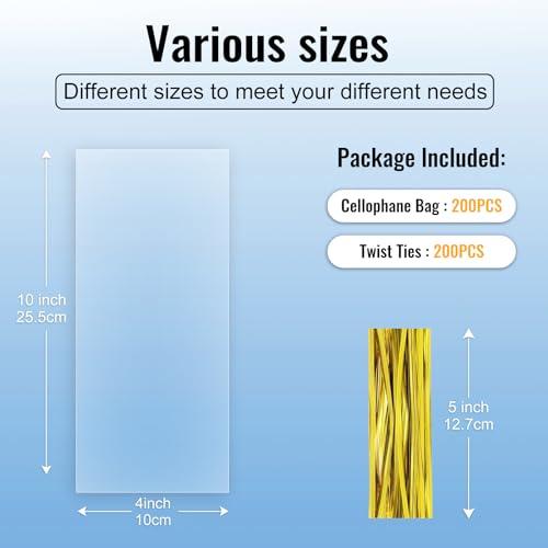 - WHAT YOU WILL GETPack of 200pcs, 4x10 inches flat cellophane treat bags, come together with 200 gold twist ties, keep fresh and convenient store and re-use! Sufficient quantity for use, perfect to wrap party favors, cookies, cakes, candies, snacks, treats, and goodies.