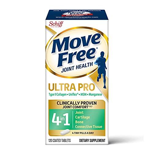 This unique joint support supplement contains Type II Collagen, Uniflex, MSM & Manganese to provide clinically proven joint comfort, help support healthy bones, help preserve & maintain healthy cartilage, and help support healthy connective tissue.* Move Free Ultra Pro 4in1 contains UNIFLEX which is a clinically tested mineral complex that supports joint comfort in as little as 2 weeks.* Our proprietary joint health blend contains Type II Collagen, the same protein found in healthy cartilage. Type II Collagen pills work with your immune system to help preserve & maintain cartilage.* Methylsulfonylmethane (MSM) is a source of sulfur found in the body that is important in the formation of collagen in joints. Collagen is a vital part of your joints because it supports the structure of cartilage.* Manganese helps support the formation of healthy connective tissue.* DIRECTIONS: Adults take four (4) tablets once a day with a meal OR two (2) tablets twice daily with meals. 30 Day Supply! The MOVE FREE product family with clinically tested ingredients, offers a range of solutions to help you move better. Because when you MOVE FREE-ly, you live freely. *These statements have not been evaluated by the Food and Drug Administration. This product is not intended to diagnose, treat, cure or prevent any disease.