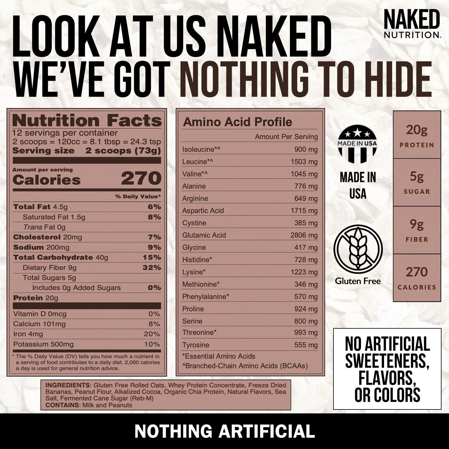 - THE NAKED DIFFERENCE: Premium ingredients you can understand and pronounce: Gluten Free Rolled Oats, Whey Protein, Freeze Dried Bananas, Peanut Flour, Alkalized Cocoa, Organic Chia Protein, Natural Flavors, Sea Salt and Fermented Cane Sugar. Nothing Artificial.