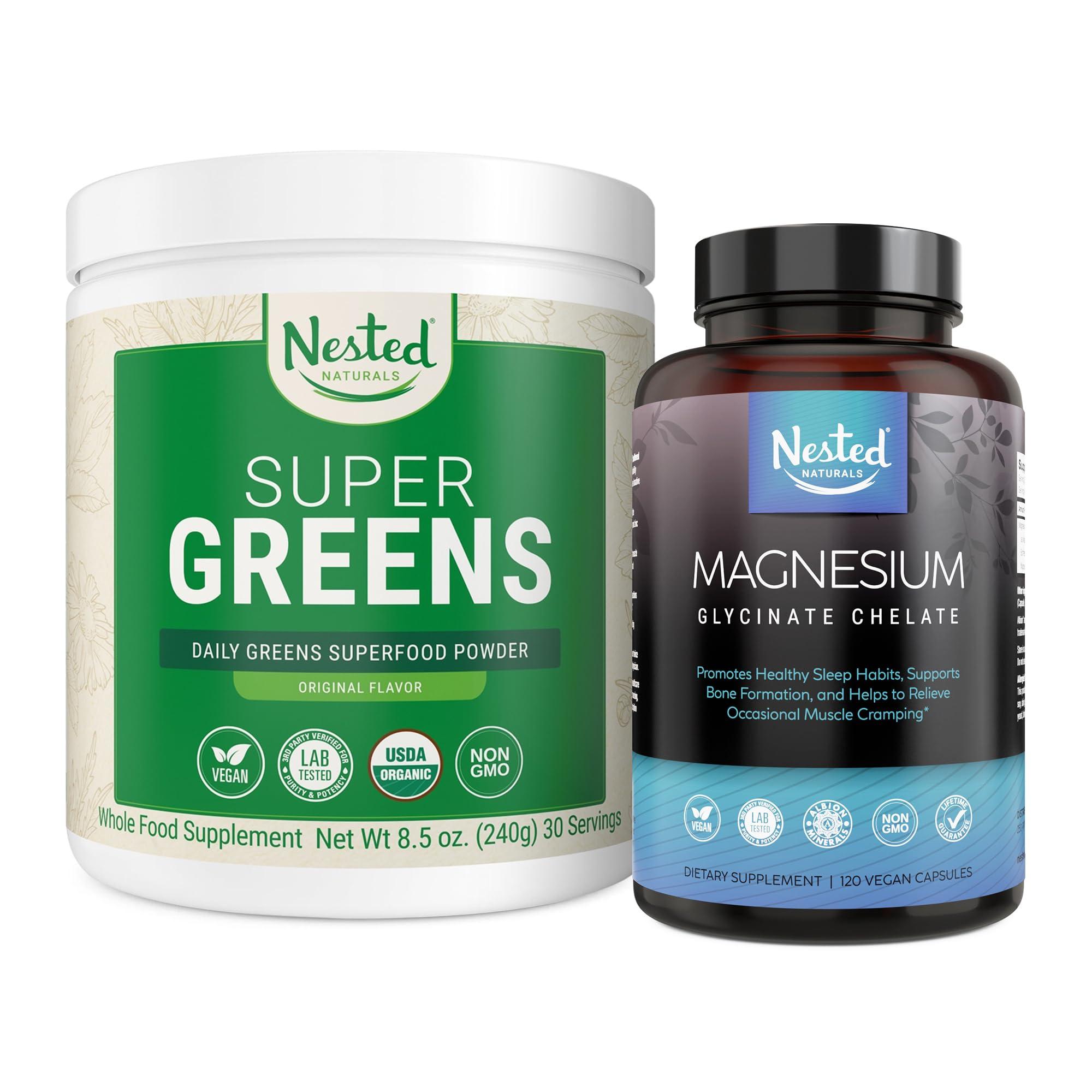 Super Greens Daily Greens Superfood Powder - Certified USDA Organic Green Powder (30 Servings) & Nested Naturals Magnesium Glycinate Chelate (120 Capsules)