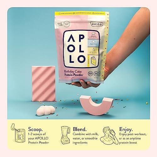 - PREMIUM PROTEIN, NOW MORE SUSTAINABLE: With 20 grams of premium protein from whey, micellar casein, and egg white, you will get the energizing protein that you deserve, in every scoop - plus, our new Perfect Day material makes Apollo birthday cake protien the most sustainable product in its category