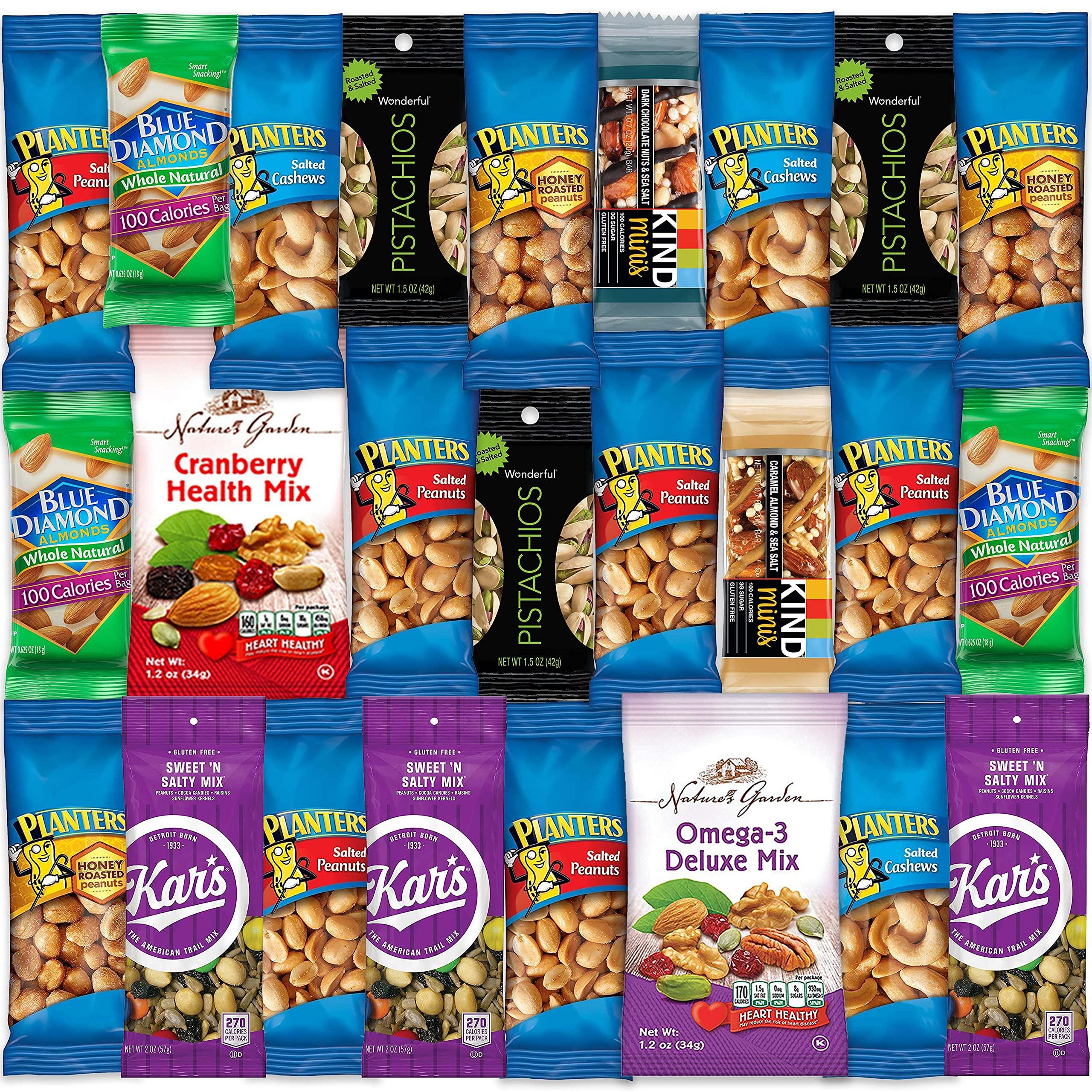 - Nut Variety Pack - Our carefully curated nut ariety pack includes 25 units of individually wrapped nuts. A mix of yummy and healthy snacks! Includes mixed nuts individual packs including Pistachios, Cashews, Almonds, Kind Minis, Peanuts & Trail Mix.