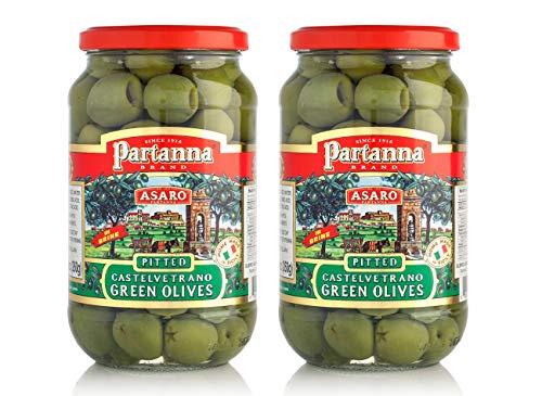 Partanna Asaro Castelvetrano Pitted Green Olives 2 Glass Jars Net Wt Jar 9 oz each.Our Olives are hand-picked, processed same day within four hours of being picked, and preserved with natural sea salt from Trapani, Sicily . The Olives are large, naturally green and have a mild, buttery flavor. They are great for snacking, and pair well with Cheese and Antipasto. Refrigerate after opening. Shipping as 2 Glass Jars Dr. Wt. 9 Oz. (260g)