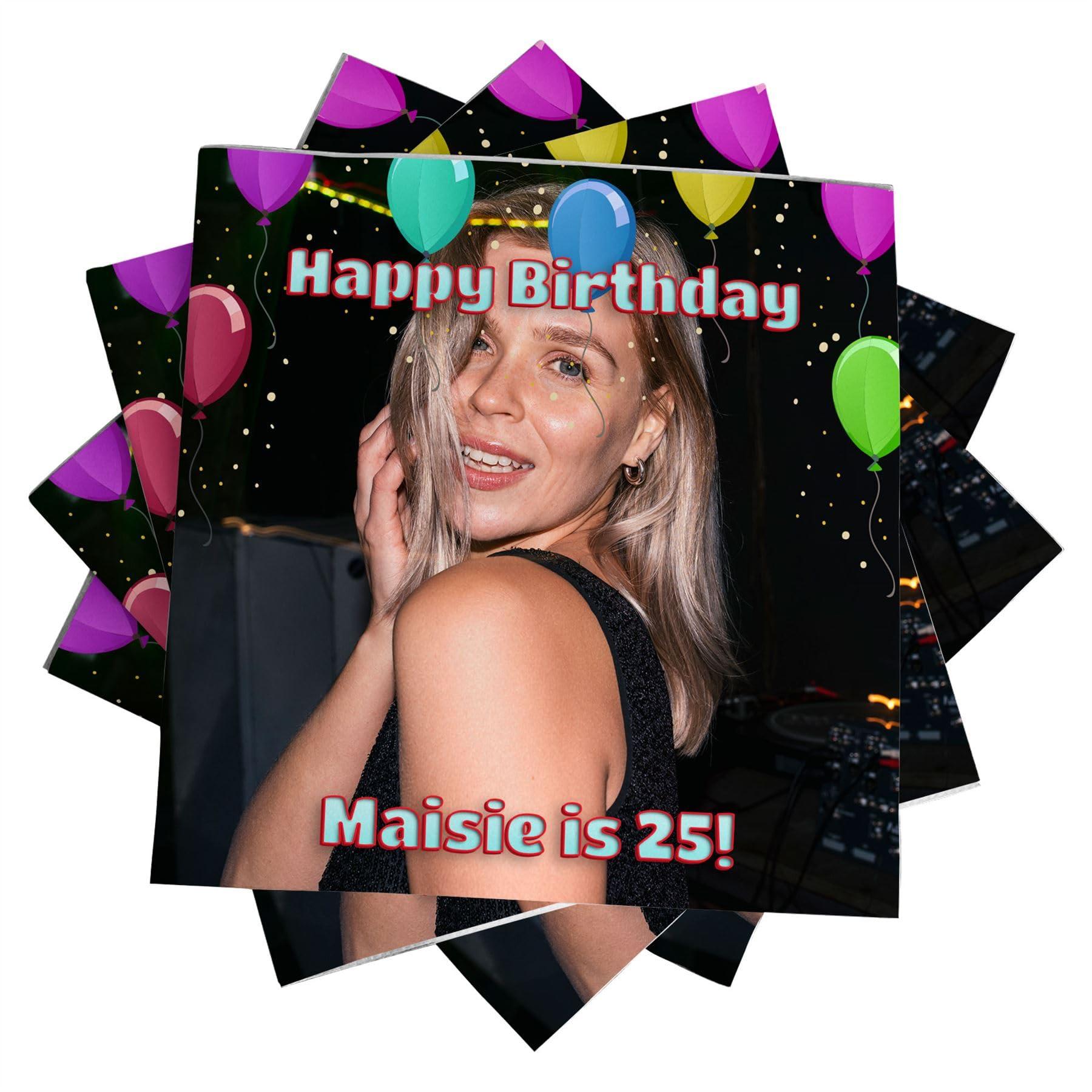 - Happy Birthday Napkins: Personalized napkins for your or anyones birthday party! Upload your photo and text to be printed onto our decorative napkins to add a personal & heartfelt touch to make for a special birthday
