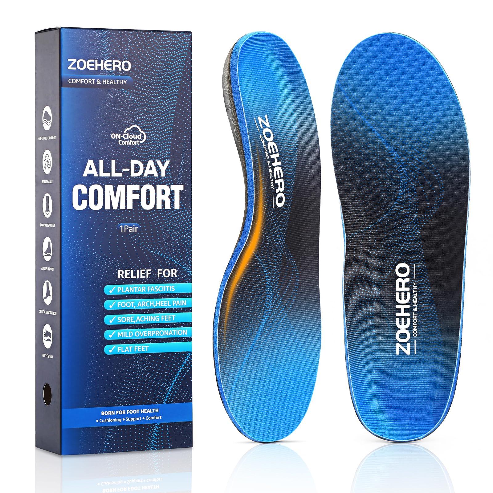 - FOOT PAIN RELIEFZOEHERO high arch support insoles feature an ergonomic 'Golden Triangle' design, with three-point support for the forefoot,arch, and heel. This design effectively relieves foot pain caused by plantar fasciitis,flat feet,heel spur,foot valgus,over pronation,fallen arch,high arch,low arch,bunions,arthritis, achilles tendonitis,standing all day.Premium podiatrist-recommended sole shoe inserts minimize foot pain and offer excellent comfort