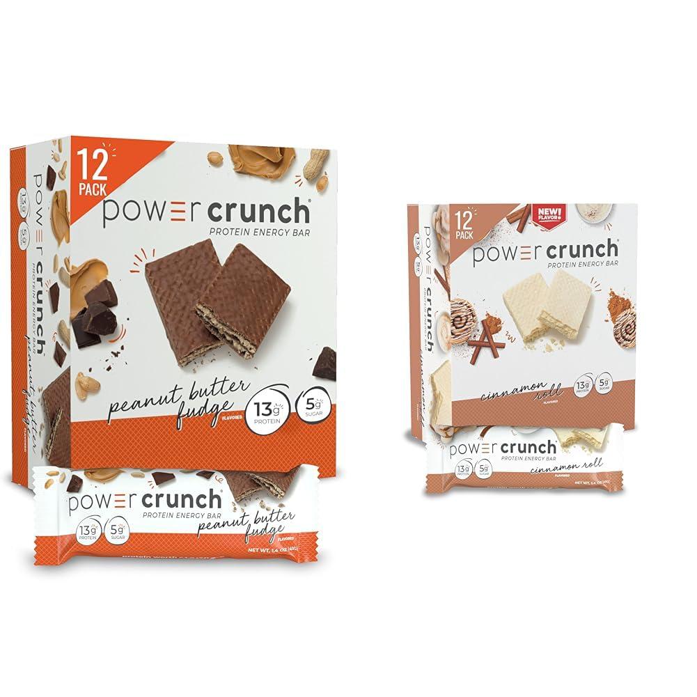 This protein bar bundle from Power Crunch includes 24 total bars with 12 Peanut Butter Fudge flavored bars and 12 Cinnamon Roll flavored bars. Both provide 12-14 grams of protein and only 5-8 grams of sugar per 1.4 ounce bar, making them a delicious high protein snack. The Peanut Butter Fudge bars offer the sweet peanut butter taste you love while packing in 13 grams of protein and just 5 grams of sugar. The Cinnamon Roll bars deliver tasty cinnamon flavor with 13 grams of protein and 5 grams of sugar. Both are made with easy-to-digest hydrolyzed whey protein and have a satisfying crispy wafer cookie to curb cravings. With high protein and low sugar, these on-the-go snacks are perfect for busy days at home, work, or school. The two flavors complement each other well for variety and combine to make the ultimate protein-packed bundle for active lifestyles.