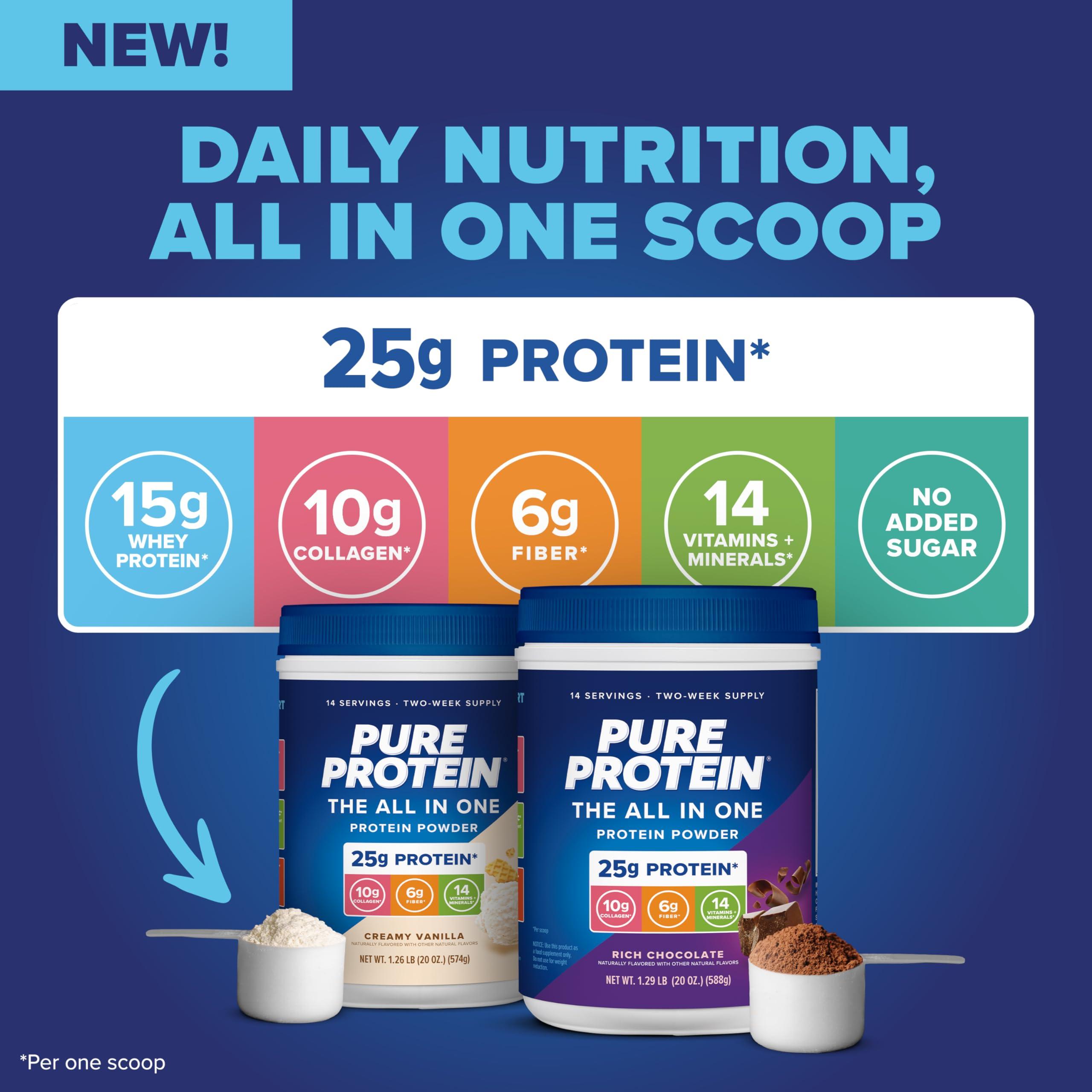 The Pure Protein All in One Protein Powder is a game-changing formula designed to simplify your daily nutrition with ingredients to help support lean muscle, skin, joints, and digestive health. Our blend of 15g whey protein, 10g collagen, 6g fiber, and 14 vitamins and minerals give you the everyday boost you need in one simple scoop. Delicious in a smoothie to start your day, or simply shake and enjoy post-workout. It's nutrition made easy, giving you more time to do what you love. Third Party Tested