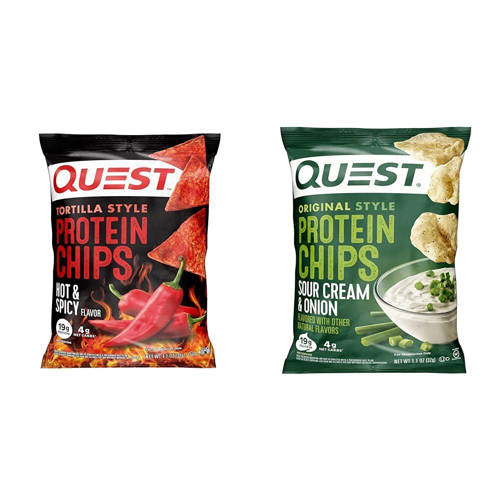 - Product 2: ENJOY MORE. CARB LESS: The Quest Sour Cream & Onion Original Style Protein Chips provide all the crunch and satisfying taste of a regular chip. Only ours have 19g of protein and 4g net carbs per bag.
