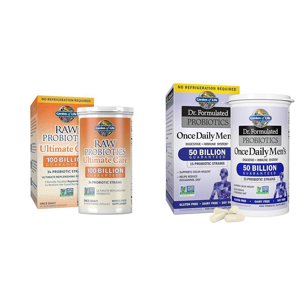 This probiotic bundle combines Garden of Life's Raw Probiotics Ultimate Care capsules with their Dr. Formulated Once Daily Men's probiotic capsules to provide comprehensive digestive and immune system support for men. The Raw Probiotics Ultimate Care capsules contain a high potency formula with 100 billion CFU across 34 probiotic strains, including clinically studied Bifidobacterium to help repopulate the GI tract. It also includes digestive enzymes and a raw blend of fruits and vegetables to aid digestion. The Dr. Formulated Once Daily Men's capsules provide 50 billion CFU across 15 probiotic strains selected for men's health needs, including Lactobacilli and Bifidobacteria to support digestive regularity, occasional gas relief, and colon health. It also contains prebiotic fiber to promote probiotic growth. Together, these complementary formulas offer a diverse array of probiotic strains in high potencies to comprehensively support men's digestive and immune health. The Raw Probiotics formula focuses on high counts and studied strains while the Dr. Formulated formula tailors the strains and adds prebiotic fiber based on men's needs. Both are vegetarian, shelf-stable, non-GMO, gluten-free and made in the USA without artificial ingredients.