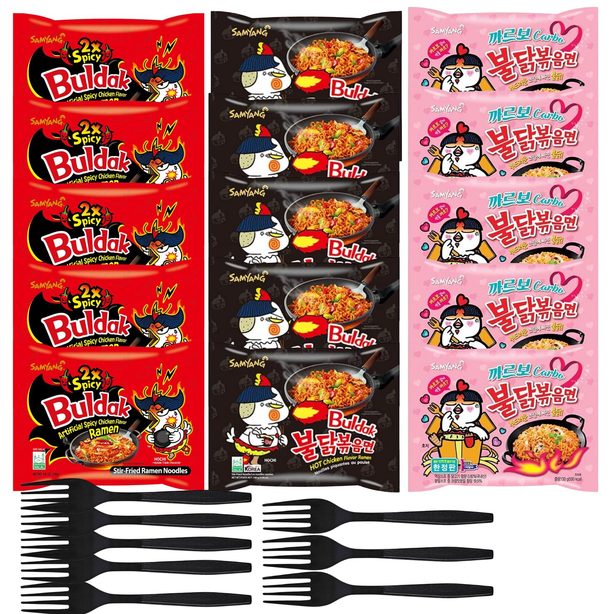 Samyang Buldak Chicken Flavor Ramen Variety Bundle : Included 5x Spicy Chicken Original | 5x Carbonara | 5 2X-SPicy| Great For The Fire Noodle Challenge | and College Students | Busy Folks | KPOP Fan with Complimentary 8x Plastic Fork ( Single Wrappe