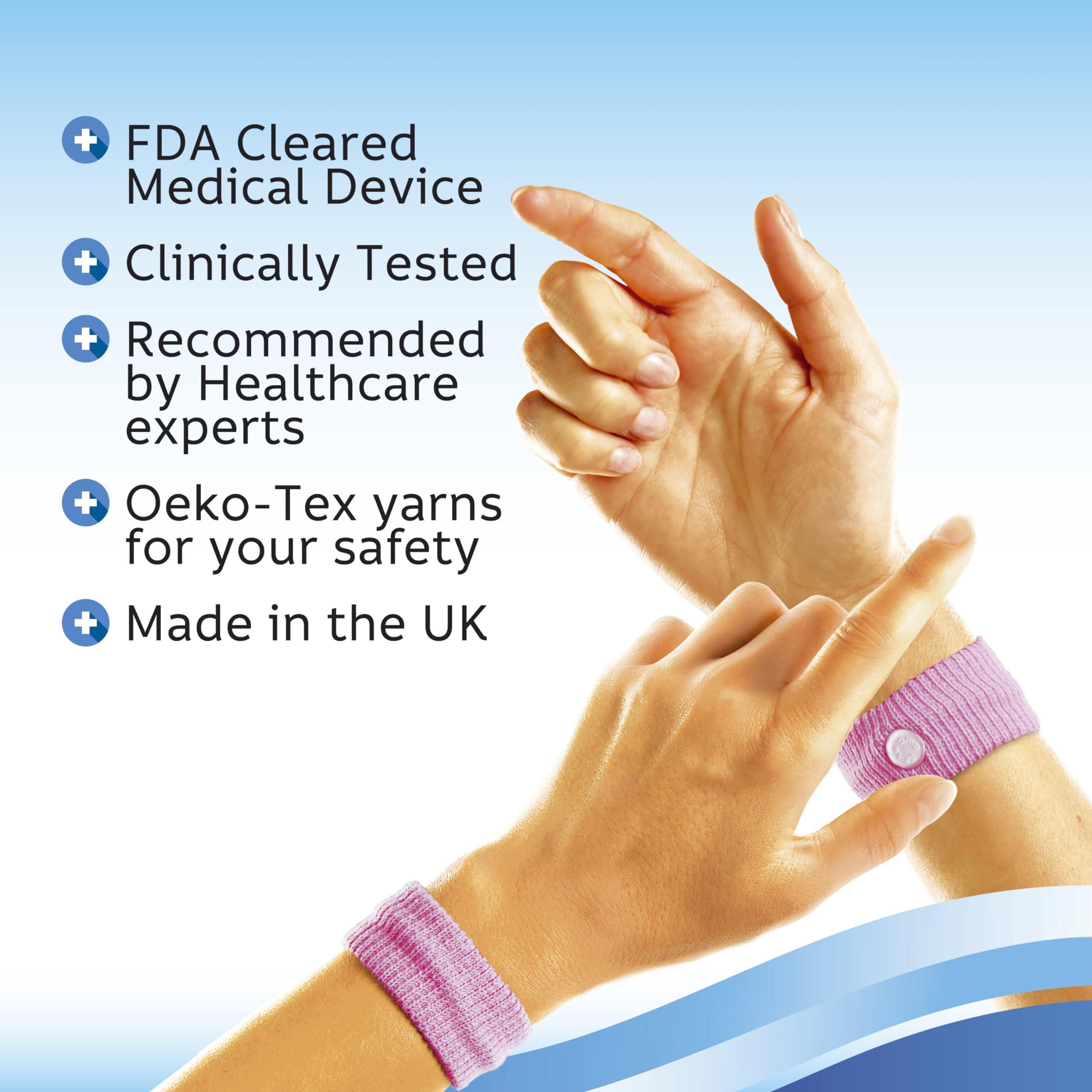 • Wristband for nausea relief: Sea-Bands work by applying pressure to the P6 (Nei Kuan) acupressure point on each wrist; Applying pressure to this point has been proven to relieve nausea and vomiting.