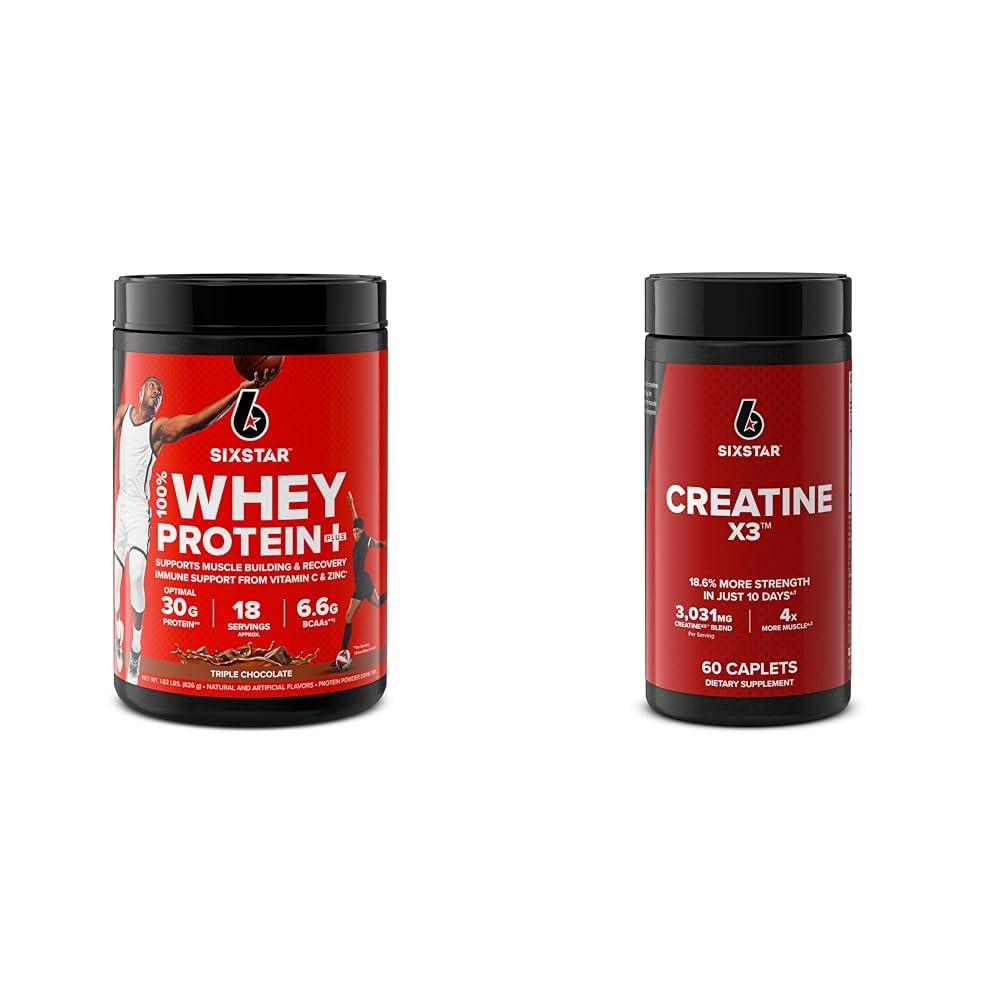 The Six Star Elite Series 100% Whey Protein Plus Triple Chocolate and Six Star Creatine Pills bundle provides a powerful combination of protein and creatine to support muscle growth and post-workout recovery. The 1.8 lb tub of Six Star 100% Whey Protein delivers 30g of pure whey protein per scoop to fuel workouts and recovery. It features a complete amino acid profile with 13.4g BCAAs and is enhanced with an immune support matrix including Vitamin C and Zinc. Enjoy the rich triple chocolate flavor mixed with water or milk. Complement the protein with Six Star Creatine pills, providing an ultra-convenient 8,000mg creatine blend in capsule form. The creatine monohydrate and creatine HCl saturate your muscles, accelerating between-set recovery so you can train harder for longer. Creatine helps restore ATP energy stores in muscles by transforming ADP back into ATP. The fast-absorbing carbs rapidly replenish glycogen supplies. 2,500mg taurine and BCAAs further boost muscle performance and growth. Together this powerful bundle floods your muscles with premium protein and creatine to help you smash personal records and make rapid strength and size gains.