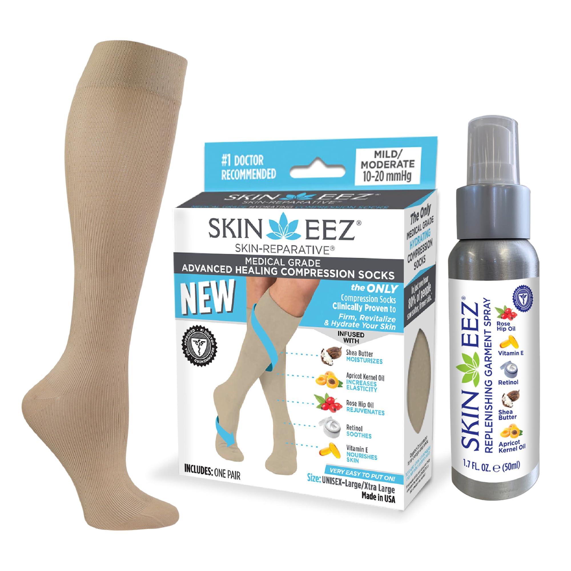 - MADE IN THE USA our compression socks are made to last when paired with Skineez Garment Replenishing Spray (sold separately). After 10 washes, or as needed, spray Garment Replenishing Spray inside the garment to restore benefits and extend the life of a Skineez garment. 91% Nylon/ 9% Spandex. For Men and Women. Size Large/X-Large. 1 Pair (Pack of 1)
