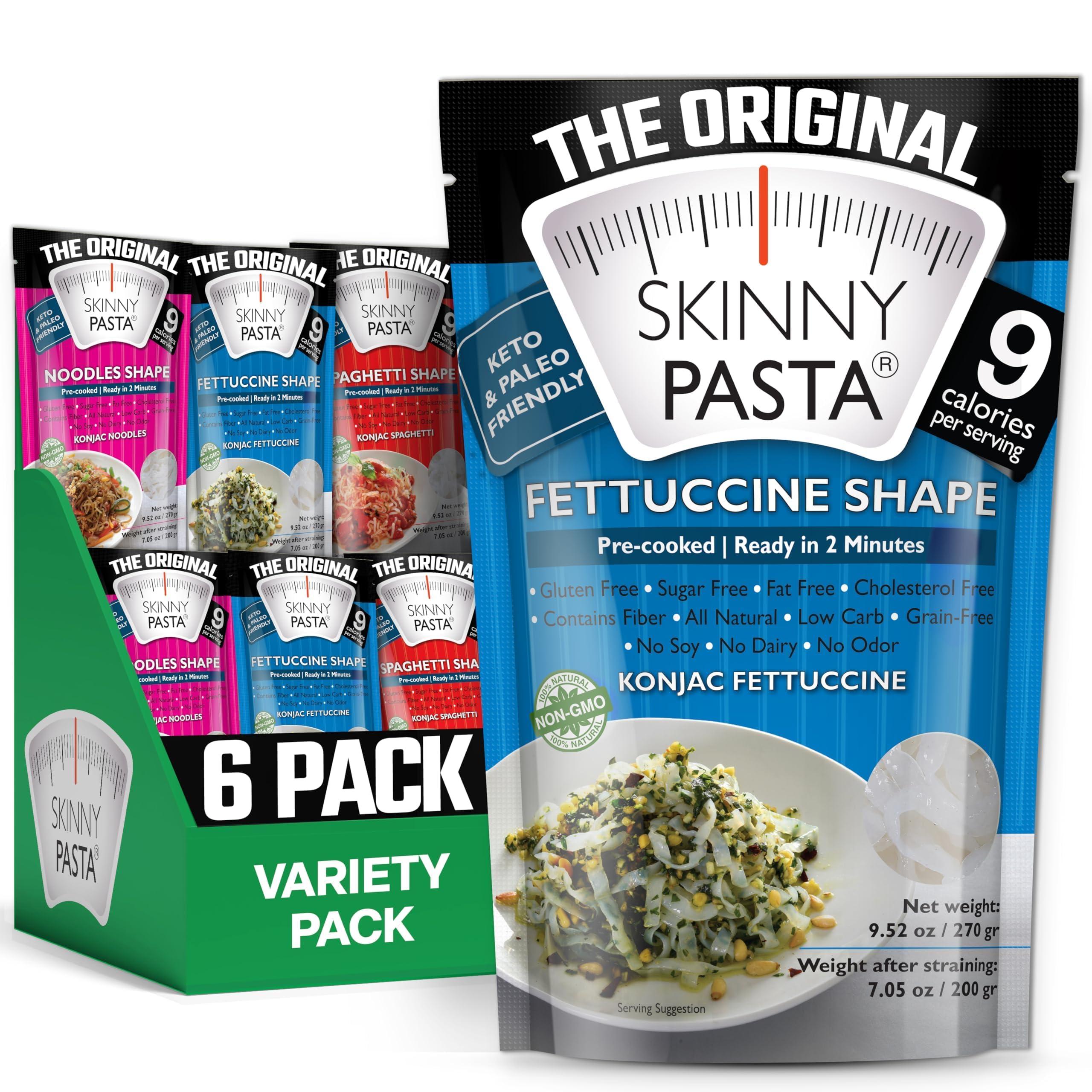 - PROMOTES HEALTHY WEIGHT LOSS -- Konjac-based pasta, Skinny Pasta promotes healthy weight loss with a delicious food staple that's only 9 calories per serving. Available in a traditional noodle shape, couscous, spaghetti, lasagna, fettuccini, and rice, each is completely free of sugar, gluten, starch, wheat, lactose, soy, salt, cholesterol, and preservatives.