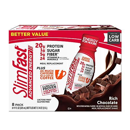 Shake up your morning routine and give your weight loss a caffeine kick with Advanced Energy Rich Chocolate Meal Replacement Shake. With as much caffeine as a cup of coffee, this naturally-flavored, gluten free, and ready-to-drink shake for chocolate lovers is deliciously convenient. Fuel up with 20g of protein, 1g of sugar, 5g of fiber, 24 vitamins (including A, C, D, E) and minerals plus zinc. It's the decadent chocolatey shake that helps you stay on track. Part of the clinically proven SlimFast Plan, these shakes make weight loss as easy as 1-2-3. Enjoy one sensible meal, two SlimFast meal replacements, and three snacks. The SlimFast Plan is clinically proven to help you lose weight fast and keep it off! **Based on clinical studies of the overall SlimFast 1-2-3 Plan (a calorie-controlled diet, regular exercise and plenty of fluids), demonstrating fast and sustained weight loss. Individual results may vary. Average weight loss is 1-2 lbs per week. Check with your doctor if nursing, pregnant, under 18 or following a doctor prescribed diet.