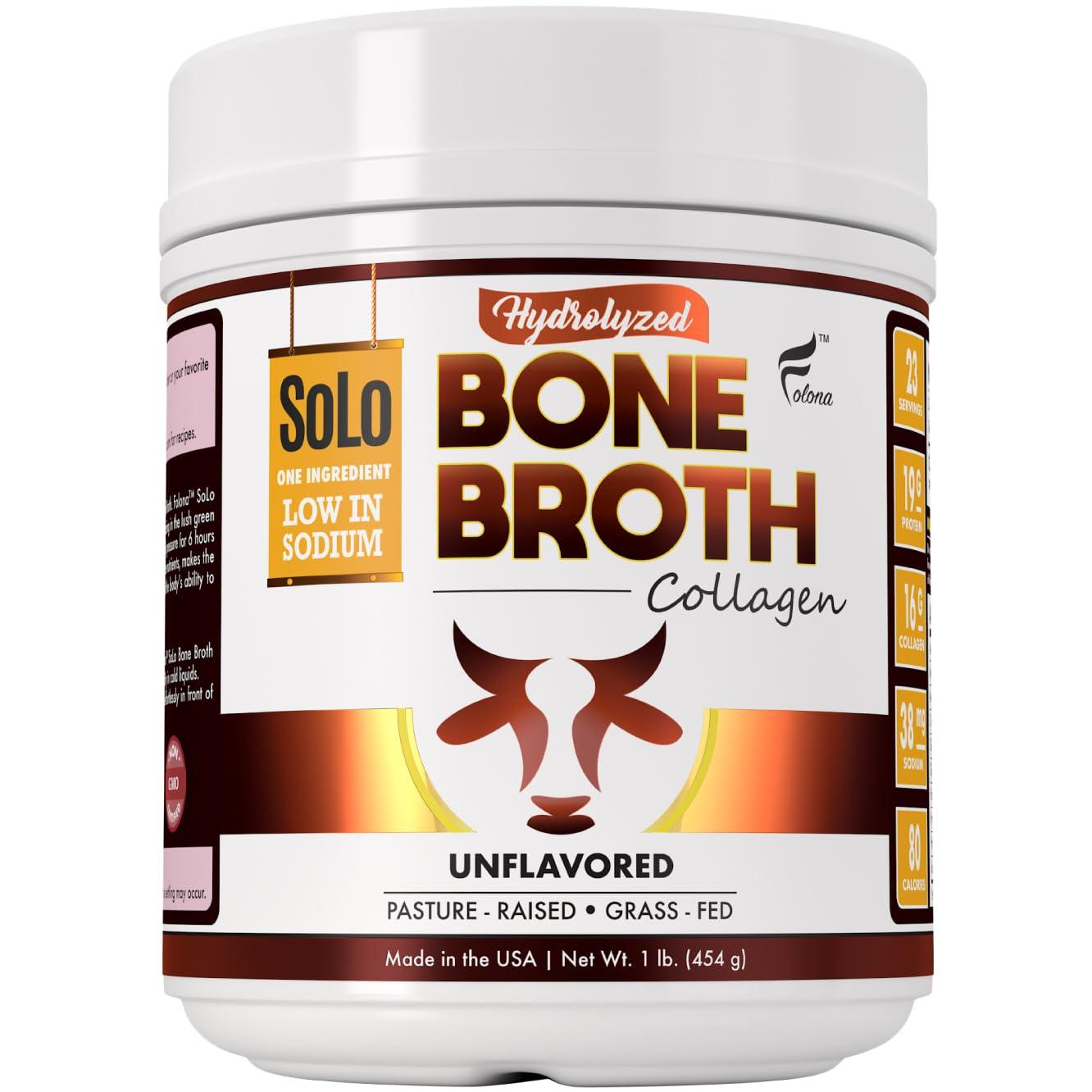 - LOW IN SODIUM The average sodium content per serving in most other products is 180 mg, Folona SoLo Bone Broth contains less than 38mg. Our proprietary processing technology using only heat effectively extracts the protein and nutrients while leaving behind the unwanted sodium (which is naturally found in bovine bones)