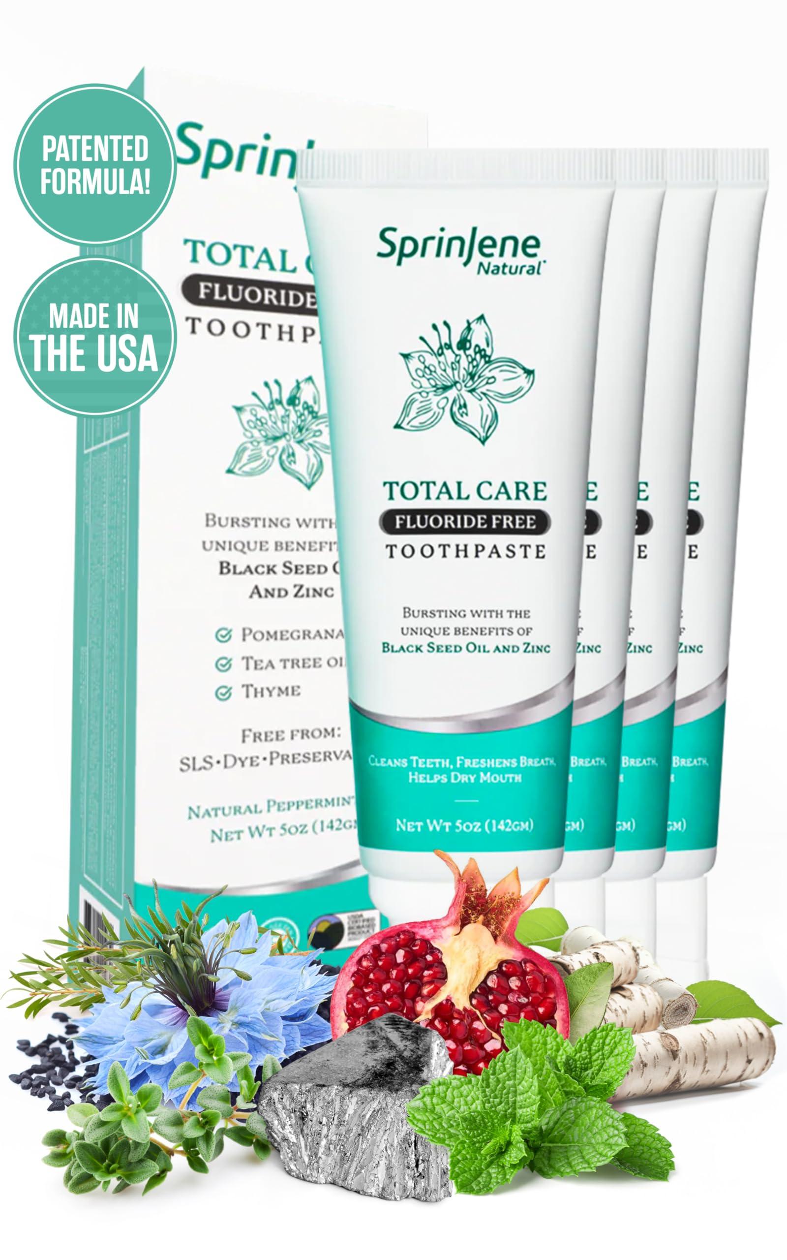- , & : SprinJene toothpastes taste great with natural peppermint oil plus tea tree, pomegranate, and thyme oils to help fight bad breath and whiten teeth.