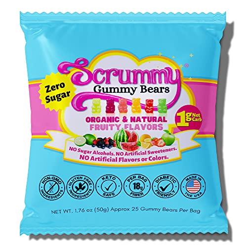 - DELICIOUS & HEALTHY SNACKS for anyone who loves the taste of low carb candy gummies! One serving = 1 whole bag. Every scrumptious bag of our Gummy Bears contains approximately 25 sugar free gummies with 19g of soluble fiber, 4g protein & 6 organic natural fruity flavors, including Lime, Mixed Berry, Strawberry, Orange, Watermelon & Green Apple. Our gummy bears are gluten-free & have just 1g Net Carbs in a whole bag.