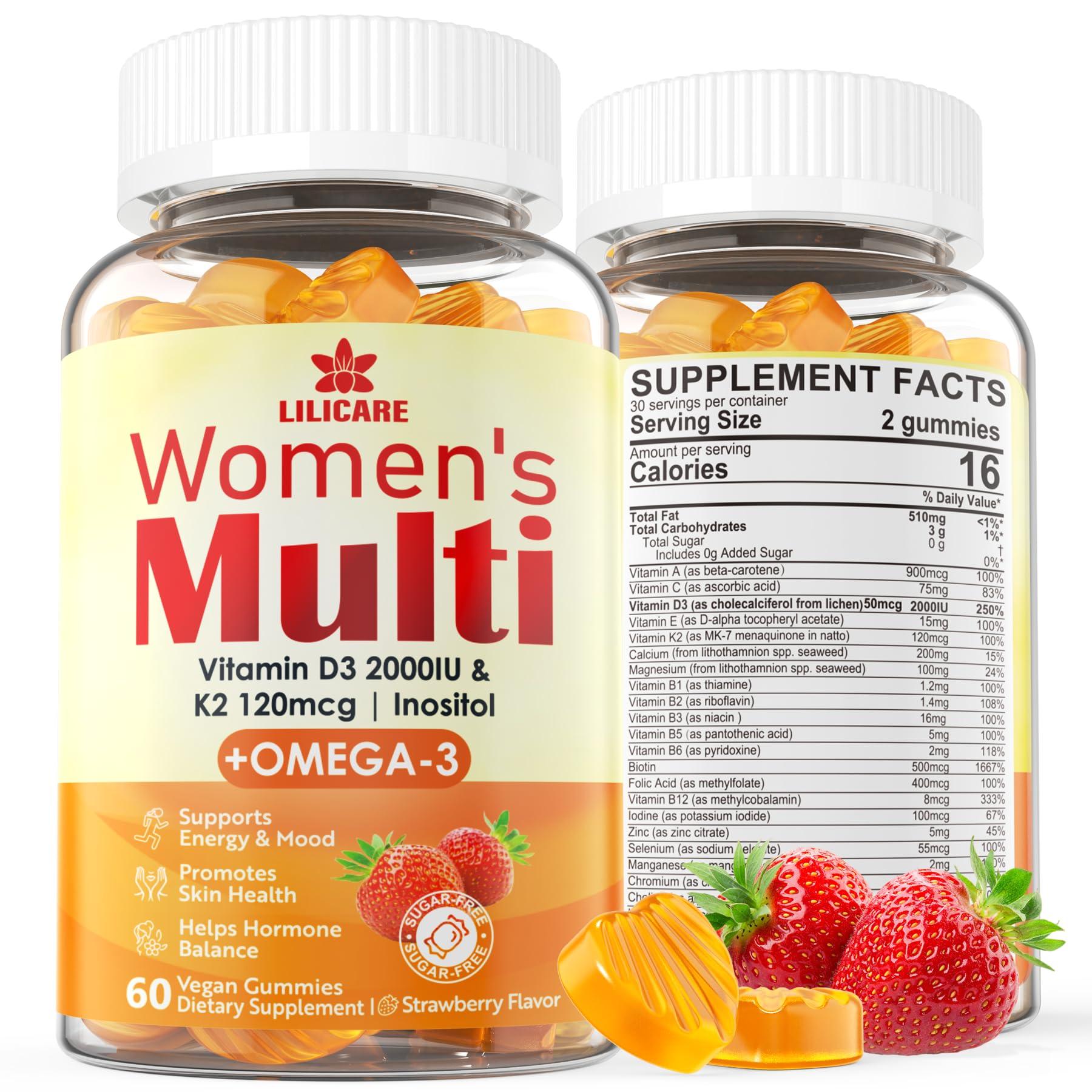 - Complete Women's Multivitamin & Multimineral: Multivitamins provide key essential vitamins and minerals to meet or exceed your daily needs. Our women multivitamin gummie packed with 20+ womens vitamins, minerals & essential nutrients to support overall health & wellness. Including botion& inositol for skin health, vitamin D3+K2 for strong bones, omega-3 for women hormore banlance and B vitamins for energy boost & ease mood. Its a feel-good formula your body will love