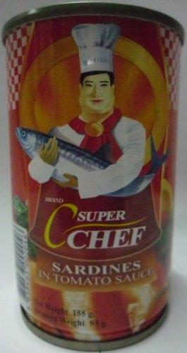 Super Chef SARDINES IN TOMATO SAUCE 155G - Canned Sardines in tomato sauce - Weight 155g. - Ingredients Sardines 60% Tomato sauce 35% Soya oil 1.5% Salt 2.5% Water 1%