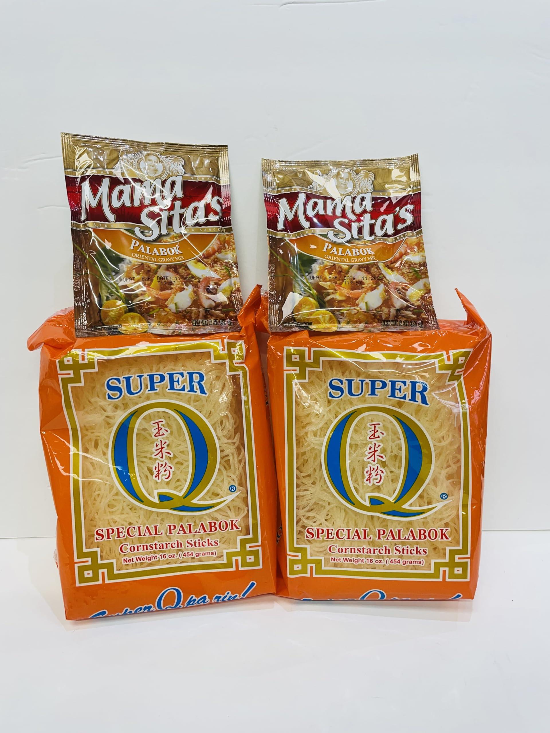 Super Q Special Palabok ( Cornstarch Sticks ) 16 oz each + Mama Sita's Palabok Mix Bundle x 2 Comes with 2 x 16 oz Super Q Special Palabok ( Cornstarch Sticks ) 2 x Mama Sita's Palabok Oriental Gravy Mix