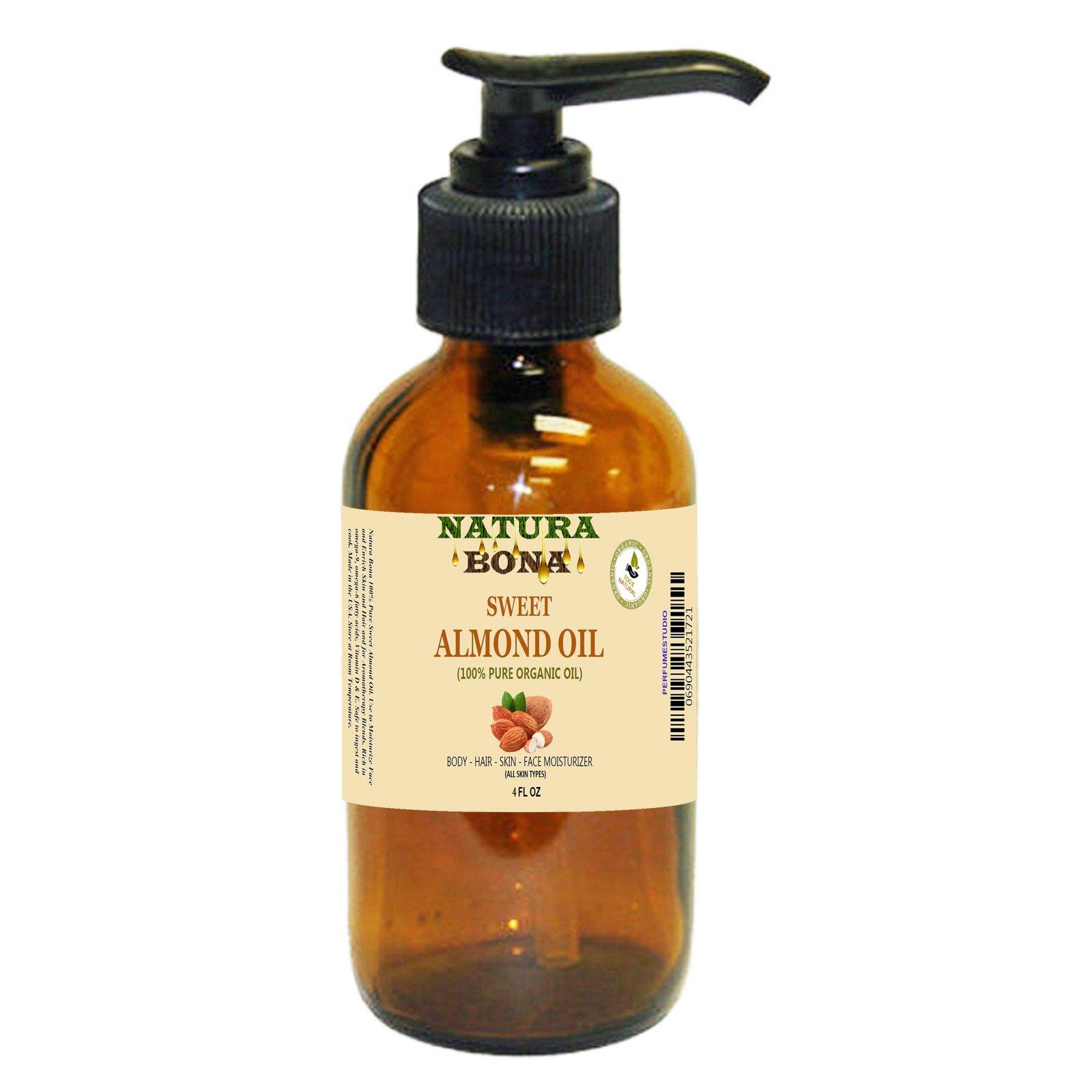 - Organic Sweet Almond Oil in a 4oz Pump Amber Glass Bottle - 100% Pure Cold-Pressed Sweet Almond Oil. Use for Aromatherapy, Skin & Hair Moisturizing