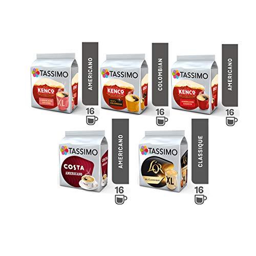 Tassimo Americano Coffee Selection - Costa Americano/Kenco Americano Grande XL/Kenco Pure Colombian/Kenco Americano Smooth/L'Or XL Classique pods - 5 Packs (80 Drinks)