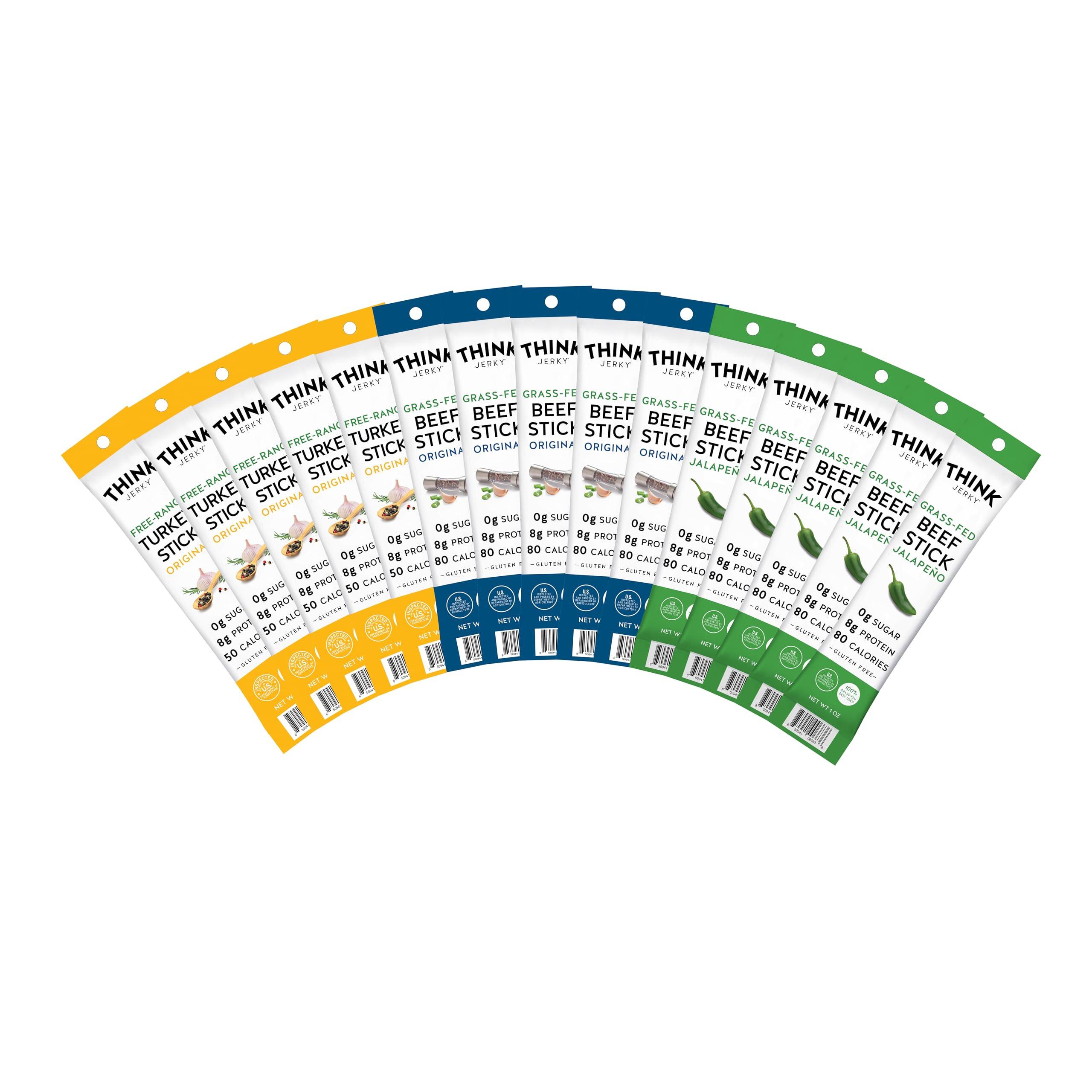 Think Jerky, Meat Stick Variety Pack, Original Grass-Fed Beef Sticks and All-Natural Turkey Sticks and Grass-Fed Jalapeno Beef Sticks (0.5 Ounce Sticks, Pack of 18 Sticks) - Sugar Free, Gluten Free, Non GMO, No Nitrates, Keto Friendly, Paleo, High Pr