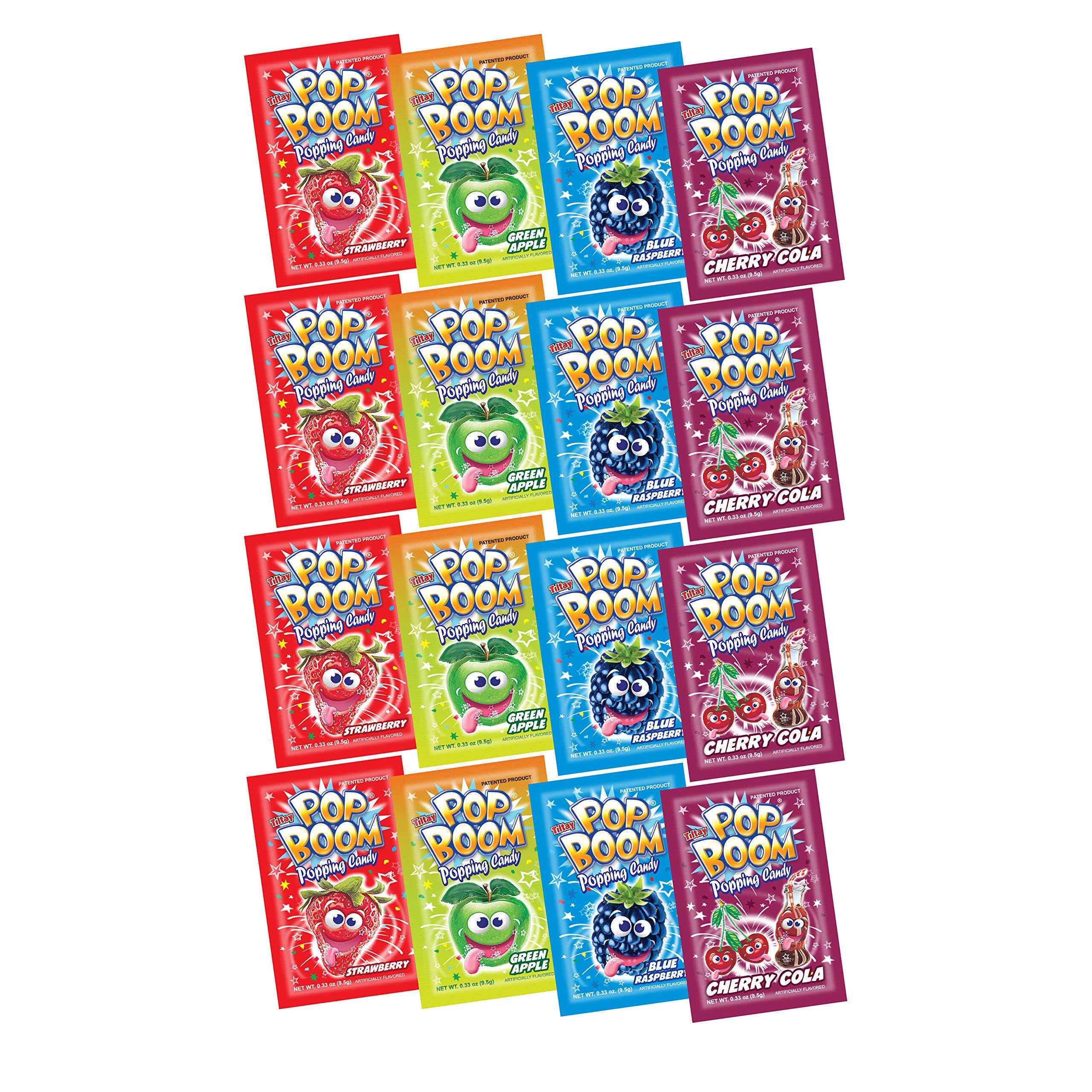 - VARIETY PACK Pop Boom Popping Candies comes in bulk; in a selection of 4 assorted candy flavors - Strawberry, Cherry Cola, Green Apple, Blue Raspberry.