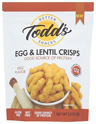 - Todd's Better Snacks Egg & Lentil Crisps, BBQ Flavor, Good Source of Protein, 12g Protein per Serving, Nut Free, Gluten Free, 2.5 Ounce (Pack of 12)