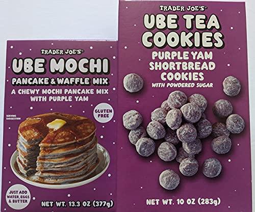 Pack comes with 1 each of the following: - Gluten free, Trader Joe's Ube Mochi pancake and waffle mix is a chewy mochi pancake mix with purple yam. Just add water, eggs, and butter! - Sweet and crumbly ube tea cookies are made from all-butter shortbread that's been mixed with slightly savory ube, the popular purple tuber from the Philippines.
