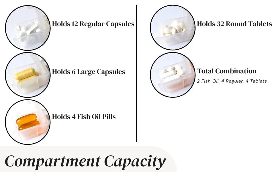 - ONE DAY, ONE BOX: Each compartment of our pill organizer comfortably holds up to 4 extra-large fish oil pills, 7 large pills, or 16 medium capsule pills. Never miss a dose with our spacious and practical design.
