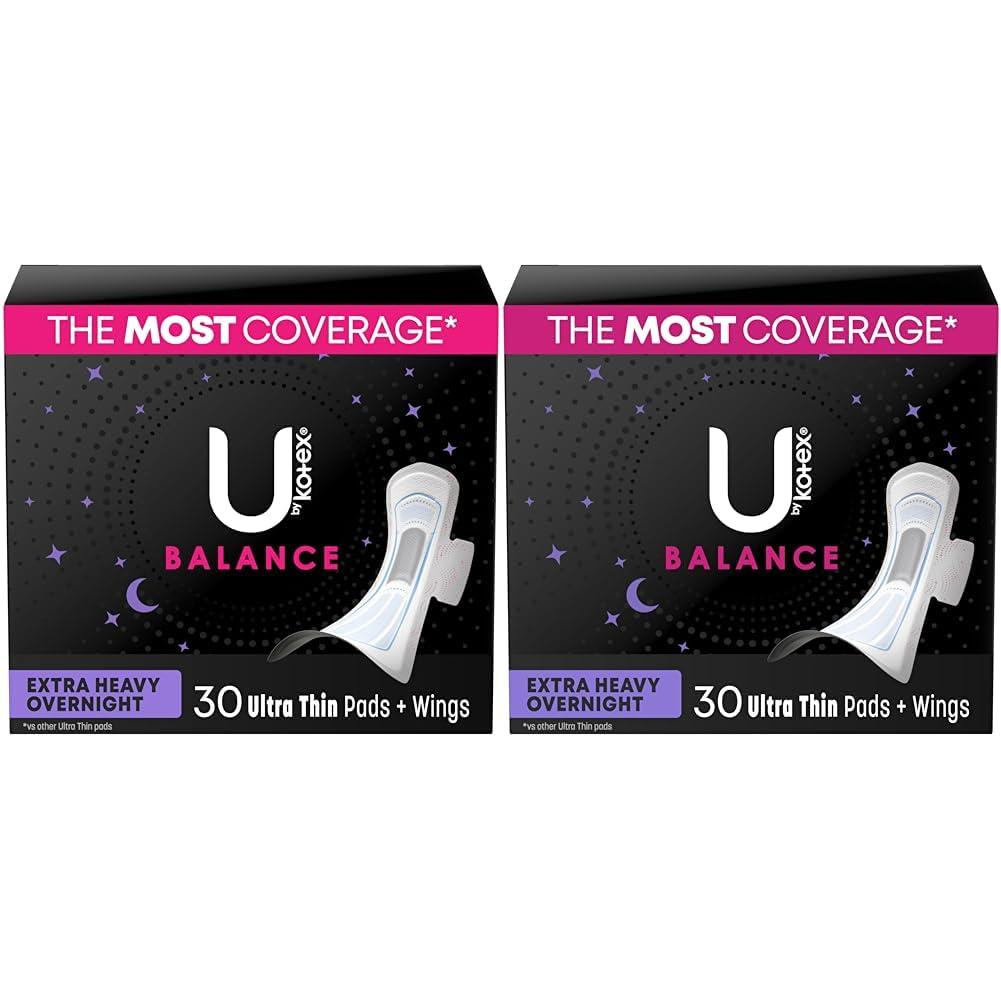 - U by Kotex Balance Ultra Thin Overnight Pads with Wings, Extra Heavy Absorbency, 30 Count; the same trusted product you love, made with no harsh ingredients