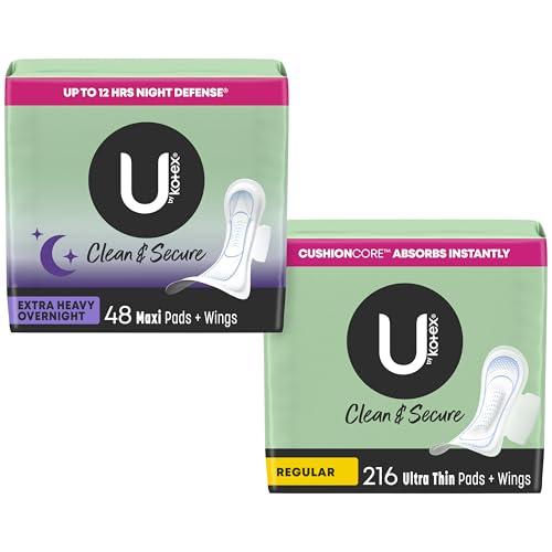 - Bundle includes: U by Kotex Clean & Secure Ultra Thin Pads with Wings, Regular (216 Count) & U by Kotex Clean & Secure Overnight Maxi Pads with Wings, Extra Heavy Absorbency (48 Count) (Packaging May Vary)