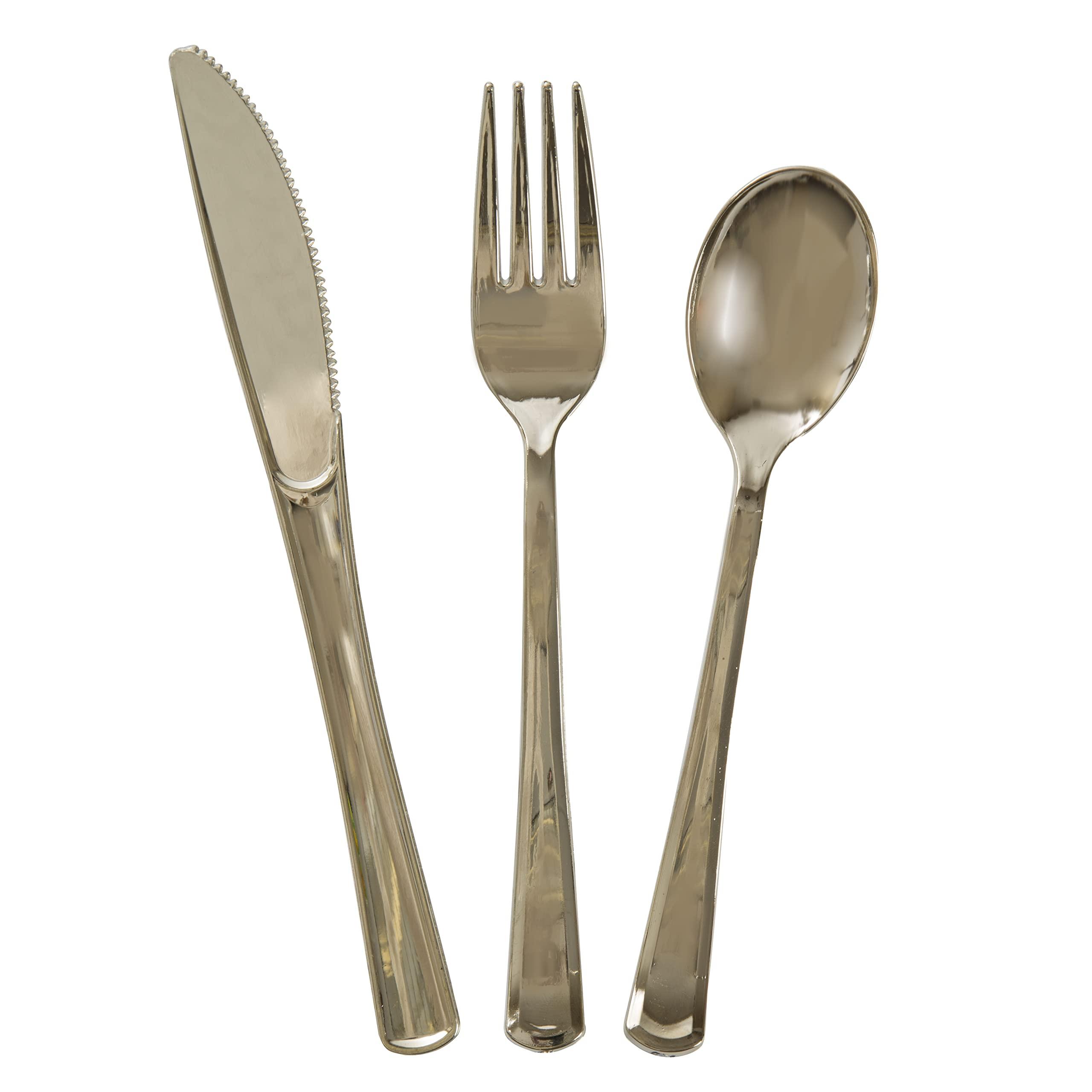 Create an elegant table setting in seconds with the help of this Metallic Gold plastic cutlery set for 6 guests. With 6 plastic knives, 6 plastic spoons, and 6 plastic forks included in the package, it will be easier than ever to throw a gold decorated bash, such as a golden birthday party or an engagement party. Keep these plastic utensils out on the buffet table for guests to grab as they need. Or, try wrapping them with napkins and tying them with a length of ribbon to make cute and convenient silverware roll-ups.