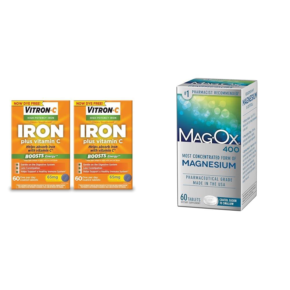 This 2-pack bundle contains Vitron-C High Potency Iron Supplement Plus Vitamin C and Mag-Ox Magnesium Mineral Dietary Supplement. The Vitron-C provides 65mg of elemental iron and 125mg of vitamin C per tablet to support red blood cell production and boost energy by helping fight fatigue from low iron levels. It also contains carbonyl iron for gradual and gentle absorption while minimizing constipation. The Mag-Ox delivers 483mg of magnesium per 2 tablet serving, which supports over 300 chemical reactions in the body including energy production and blood pressure maintenance. Both supplements are gluten-free with no artificial colors or flavors. Together these complementary supplements help ensure adequate intake of the essential minerals iron and magnesium. Iron carries oxygen to tissues while magnesium supports energy production, so this powerful pair works synergistically to promote optimal health. The added vitamin C in the Vitron-C also aids iron absorption for improved efficacy. With just one tablet per day of each supplement, users can address common nutritional deficiencies. The result is enhanced energy levels and resilience to keep up with life's daily demands.