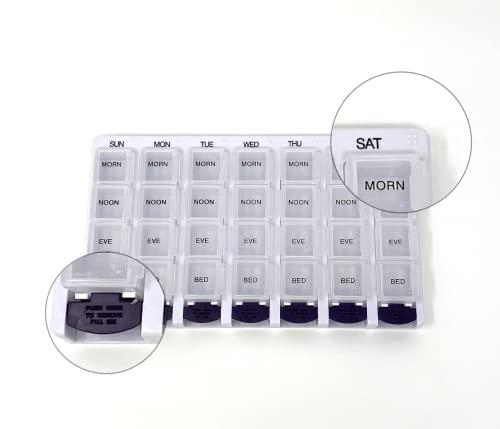 - PORTABLE DESIGN The lids of every compartment is individually button activated; perfect for elderly sufferers and convenient for caregivers alike; each lid is translucent to let you see what you need to take for the day and are clearly labeled with the days of the week along with part of the day