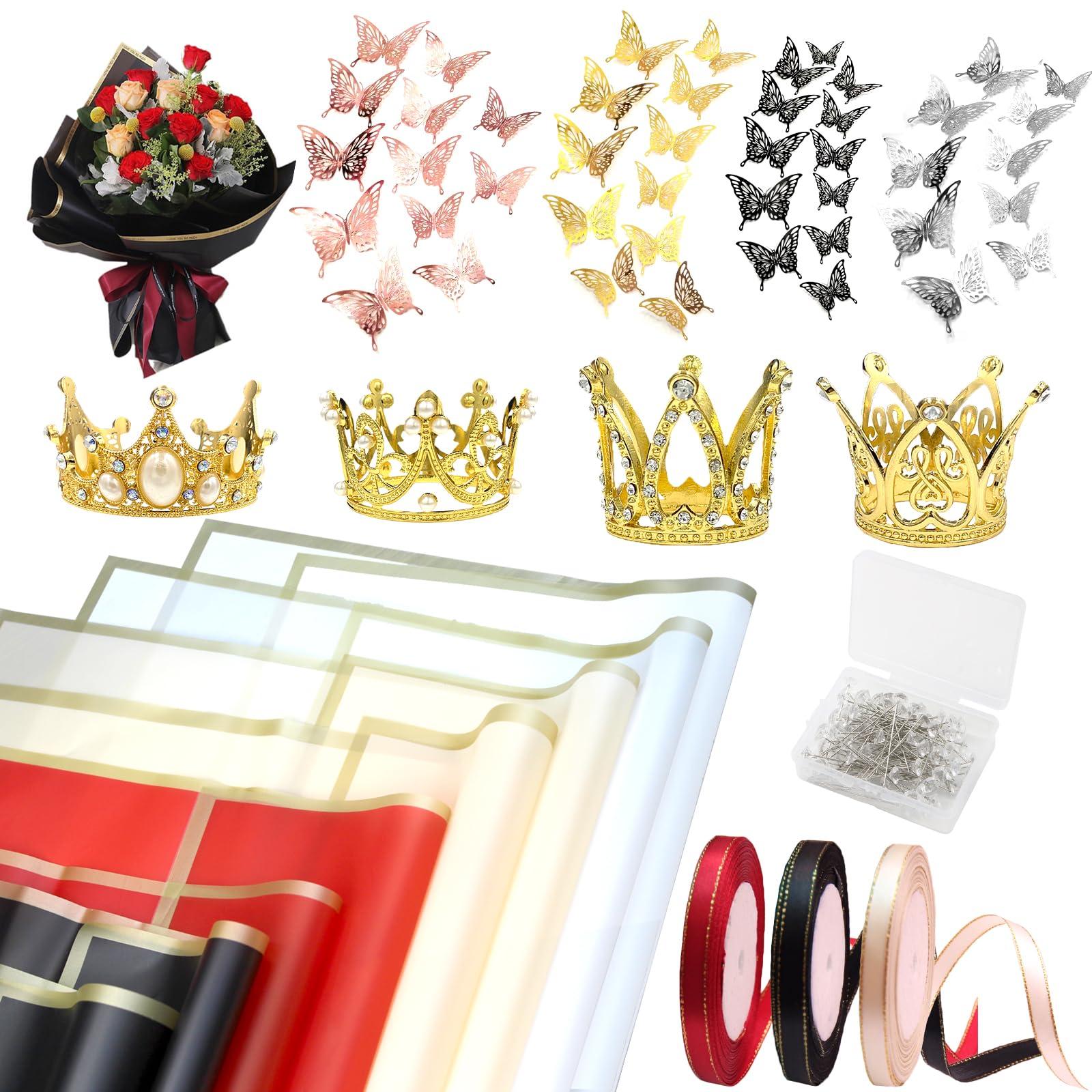 - Flower Wraps Paper Set: Our flower bouquet wrapping paper will provide you with 40 pieces of flower bouquet paper in 4 colors, 10 pieces of each color, all solid colors with gold edges; it also includes 4 mini crowns and 48 pieces of 3D butterfly decorations products, 3 rolls of ribbons and 100 bouquet pins, a total of 195 products. Sufficient quantity to meet your bouquet wrapping and gift wrapping needs.