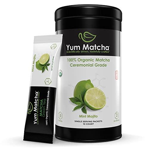 Minto Mojito Flavor Single Serving Packets (10-Pack Tin). Inspired by a classic drink, the refreshing mix of mint mojito compliments our matcha for a tasty and delightful experience. Great as a mixer in your cocktails. Each black matte finish tin canister contains 10 single serving packets. Each packet contains 2 gm of organic ceremonial grade matcha and is readily mixed into a fresh drink, anywhere and anytime.