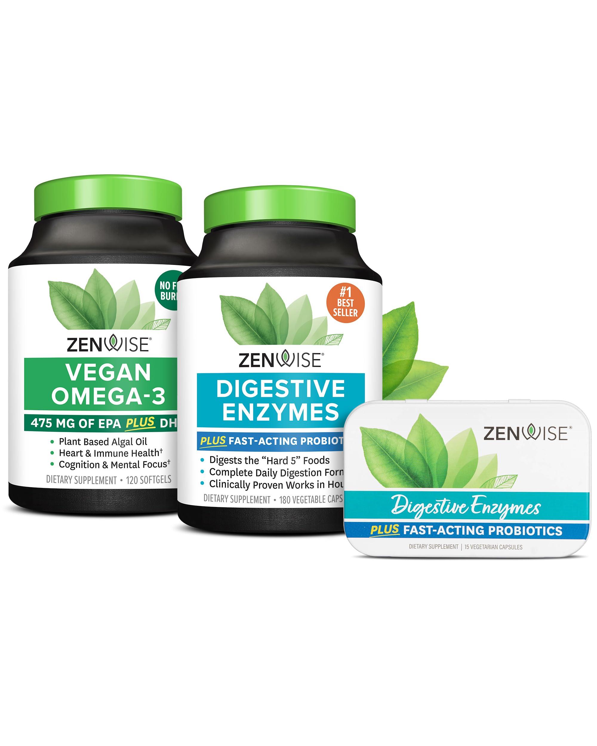 Zenwise Digestive Enzymes 180 Count, Vegan Omega 120 Count, and Digestive Enzymes Travel Tin