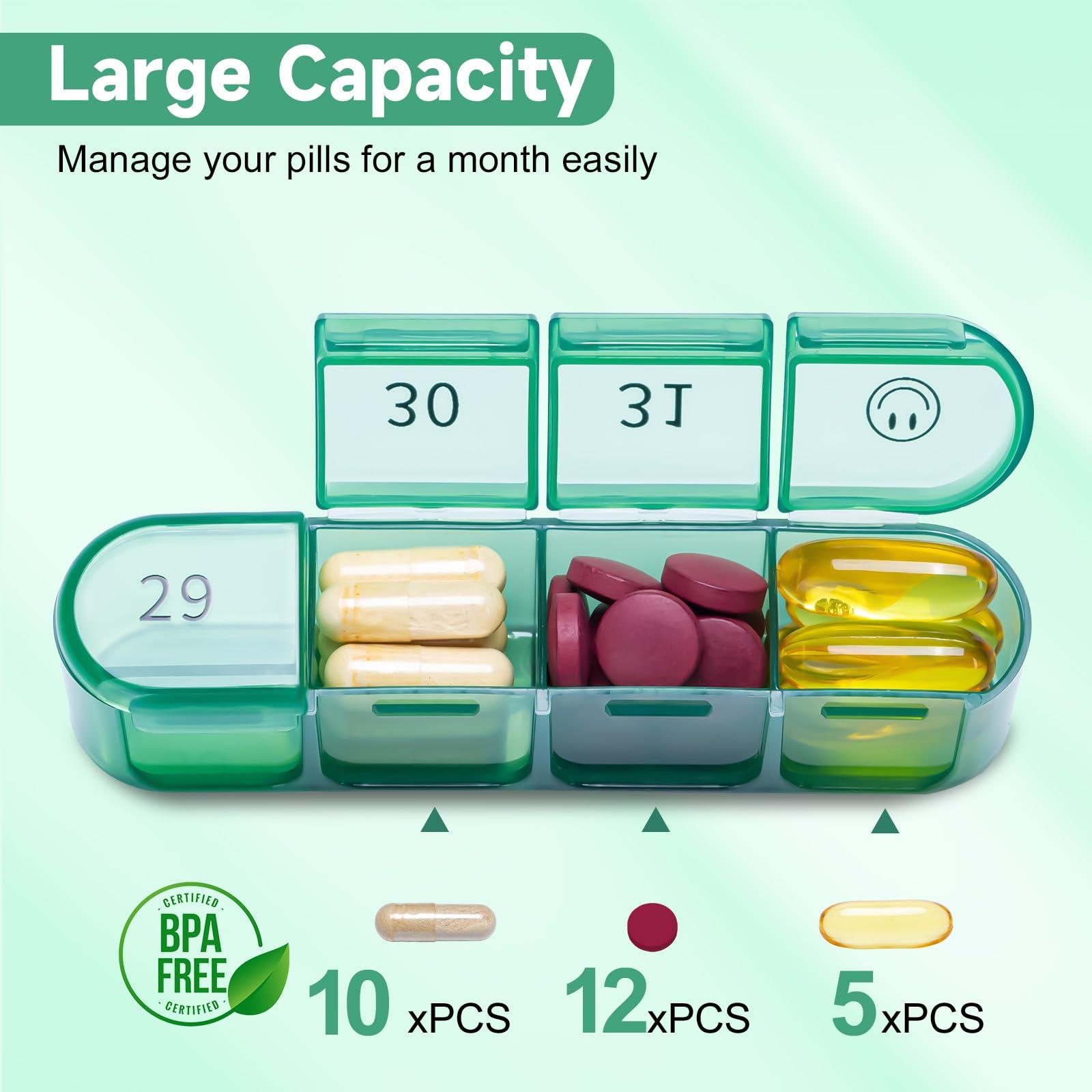 - [Monthly Pill Organizer] Zoksi monthly pill organizer 1 time a day features 31 day slots plus 1 smile for extra pills.This 30 day pill organizer once a day frees you from sorting your daily medications day by day or week by week. Easy to load your entire month's pills and save your time!